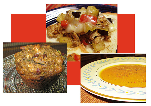 Touche! I cut off another big chunk of zucchini and diced it up. Then, I heated a pan and sauteed chicken with red peppers and onions. Finally, I stirred in the zucchini and sprinkled cumin and salsa over a sizzling pan of goodness. Mmmm, its aroma swirled through the air. After dropping colorful spoonfuls onto oven crisped tortillas, I sprinkled each with cheese and slipped the tostadas under the broiler. Minutes later, we enjoyed a heavenly meal.